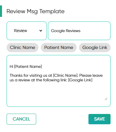 These templates can then be used in the Morning Huddle to automatically populate the Google Review invite contents, and insert the clinic name, patient name and Google review link automatically
